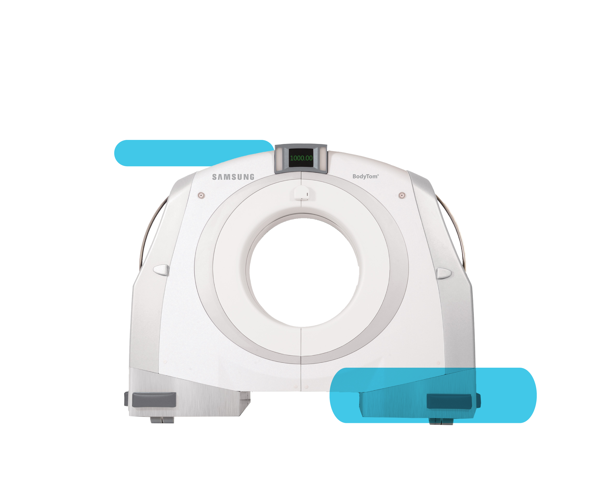 BodyTom™ es un tomógrafo multicorte compacto, móvil, con alimentación a batería o línea, diseñado para escanear anatomía centrada en un área de 85 cm de diámetro. El equipo está autoblindado, permitiendo trasladarlo y utilizarlo en cualquier área sin necesidad de tener búnker.